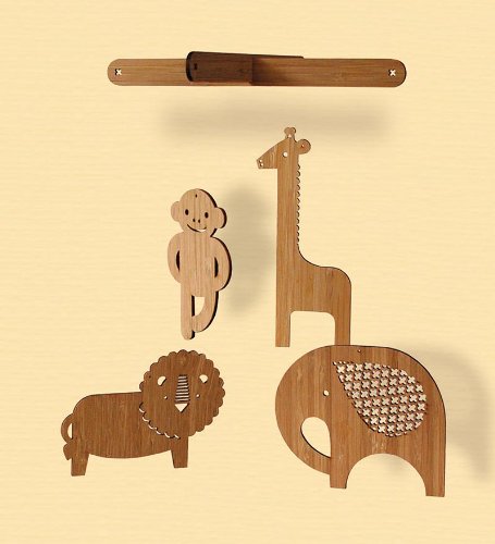 The animals in the Jungle Friends Mobile are ready to hang out! This mobile is laser-cut from sustainably harvested bamboo, an earth-friendly renewable resource. Due to the nature of the material, pieces will vary slightly in color and grain. Includes four animals (monkey, giraffe, elephant, and lion), two hanging sticks and clear thread. Your baby will be delighted to meet the four friends who make up the Jungle Friends Mobile. With its modern design and sustainable origins, you'll feel good making it a part of baby's nursery. Minimum assembly required. Handcrafted in USA. ...Read more